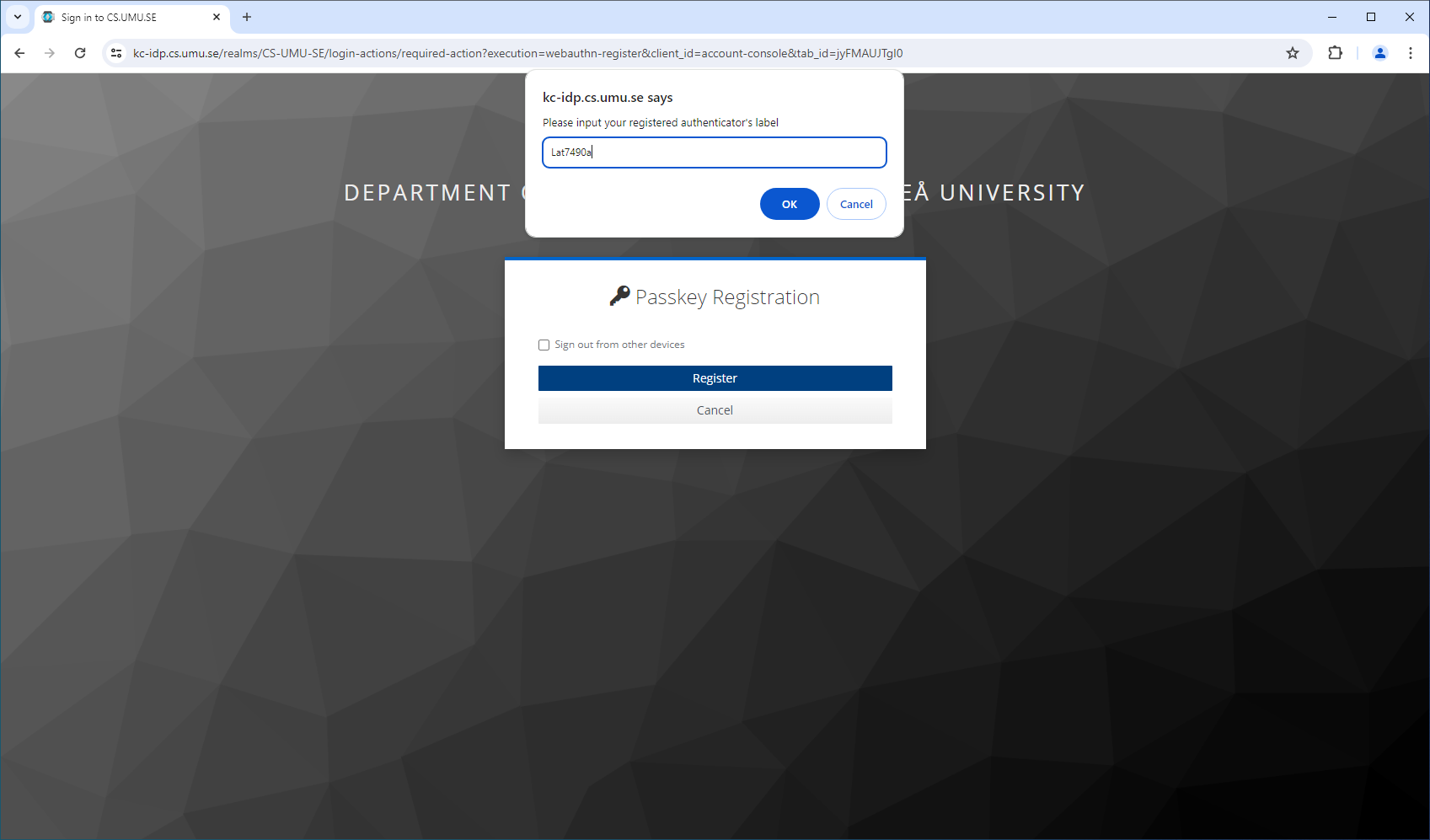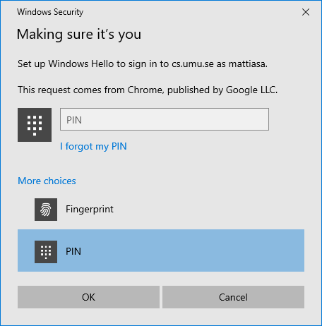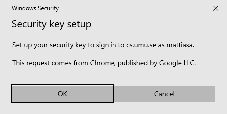 Windows will ask if you want to allow your browser (Chrome) to register a security key for the domain (cs.umu.se),