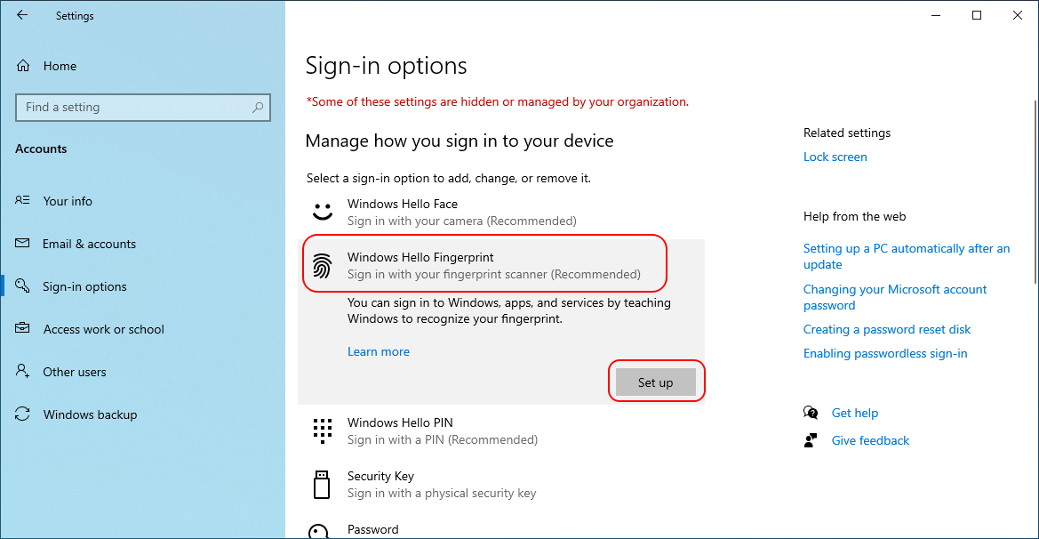 Click on Windows Hello Fingerprint then click the Set up button