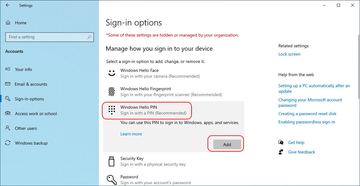 To use Windows Hello you need to set a PIN-code. Click Windows Hello PIN then click the Add button.